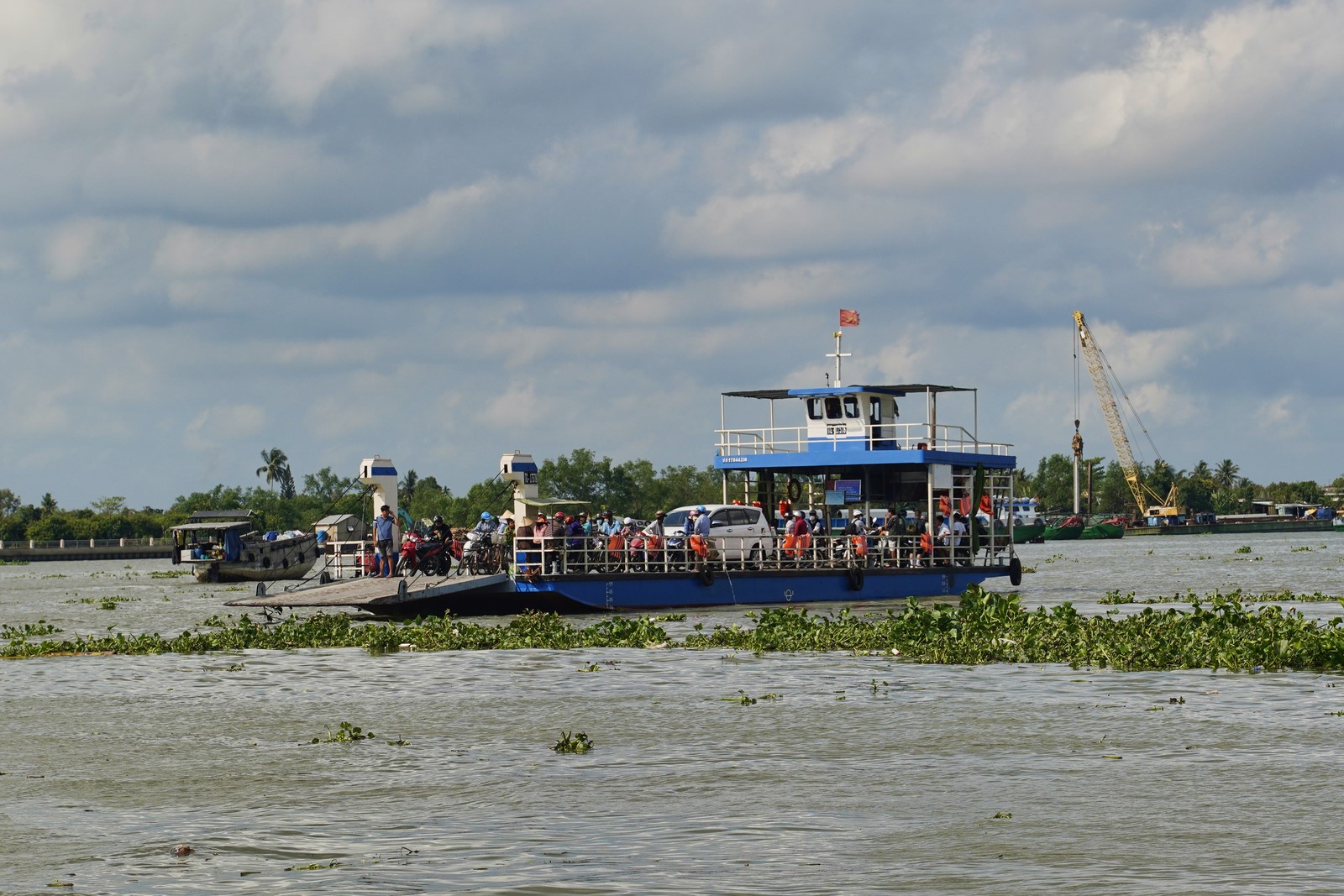 Au milieu des jacinthes d'eau (les jacinthes sont cultivées par endroit pour leur usage en vannerie, mais prolifèrent un peu partout, se détachant et flottant sur le Mékong et les canaux avoisinants) nous croisons un bac très chargé, comme tous ceux que nous verrons ici.