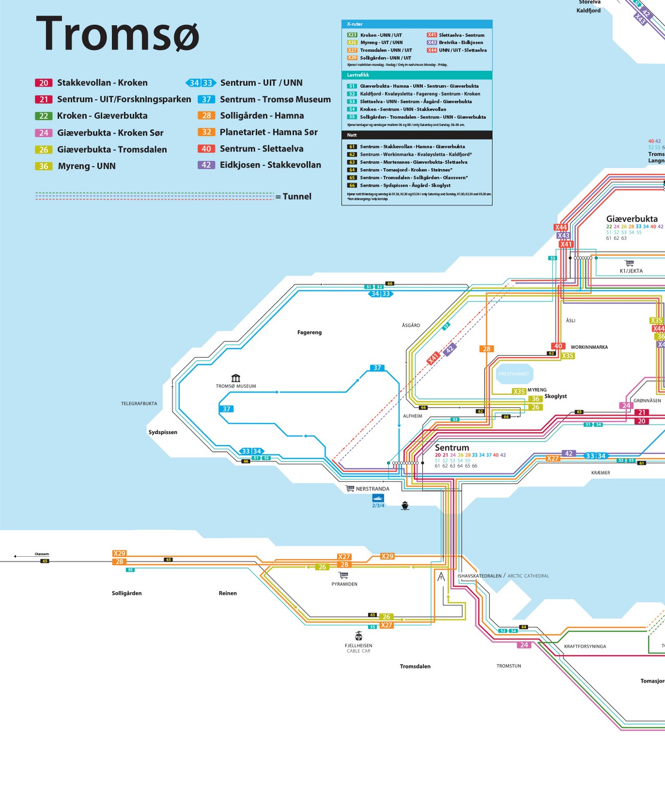 Tromsö centre est en fait une île rattachée au continent par le pont . On peut facilement visiter toute la partie île à pied, mais il vaut mieux prendre le bus pour aller la cathédrale arctique ou au téléphérique qui permet d'accéder au Mont Storsteinene.